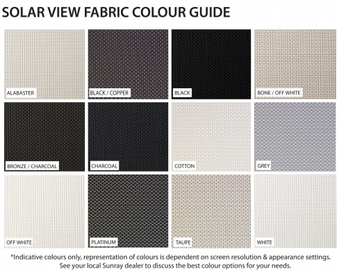Solarview offers an aesthetically pleasing screen and is designed for controlling heat and light in the harsh NZ environment and is available in 12 colours featured.